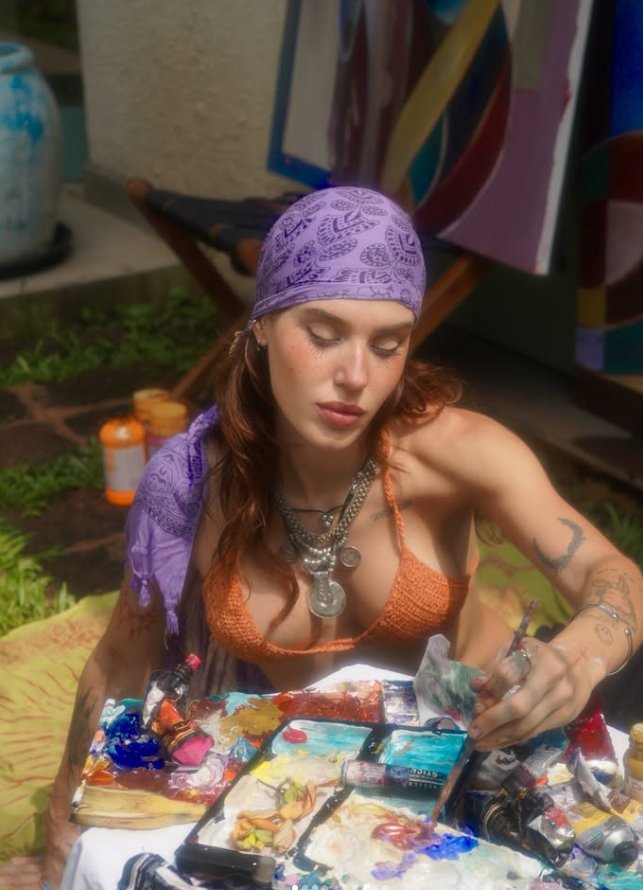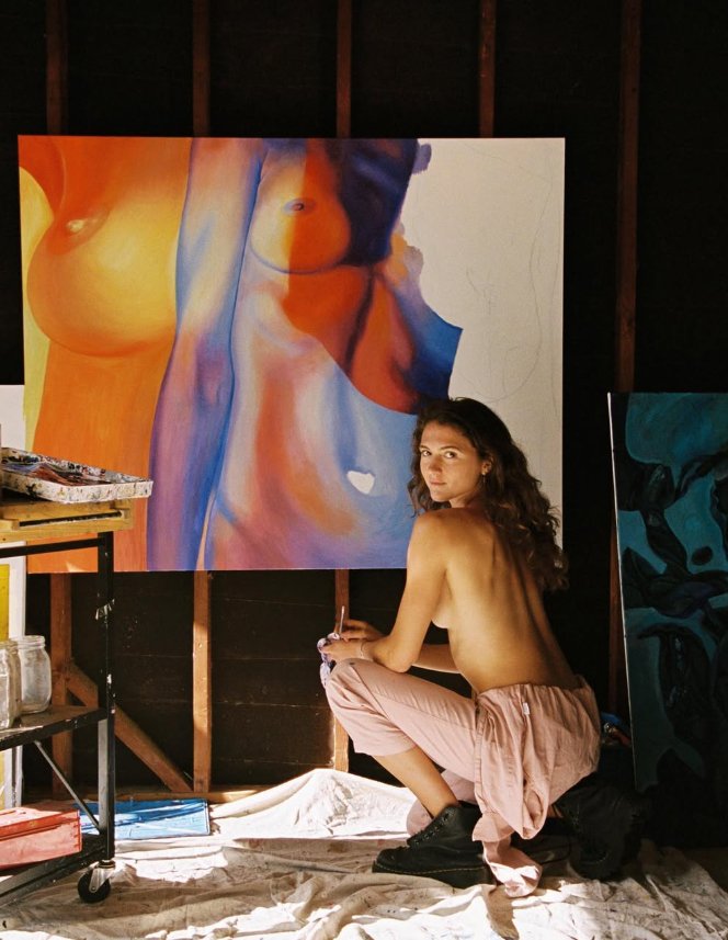 A key element of her process is the use of original photographs—both of herself and her friends—which she integrates into her work. By altering and reimagining these images, she transforms personal moments into universal symbols of self-possession, identity, and liberation. This personal touch infuses her art with a sense of intimacy and authenticity, drawing viewers into the unique narratives she creates.